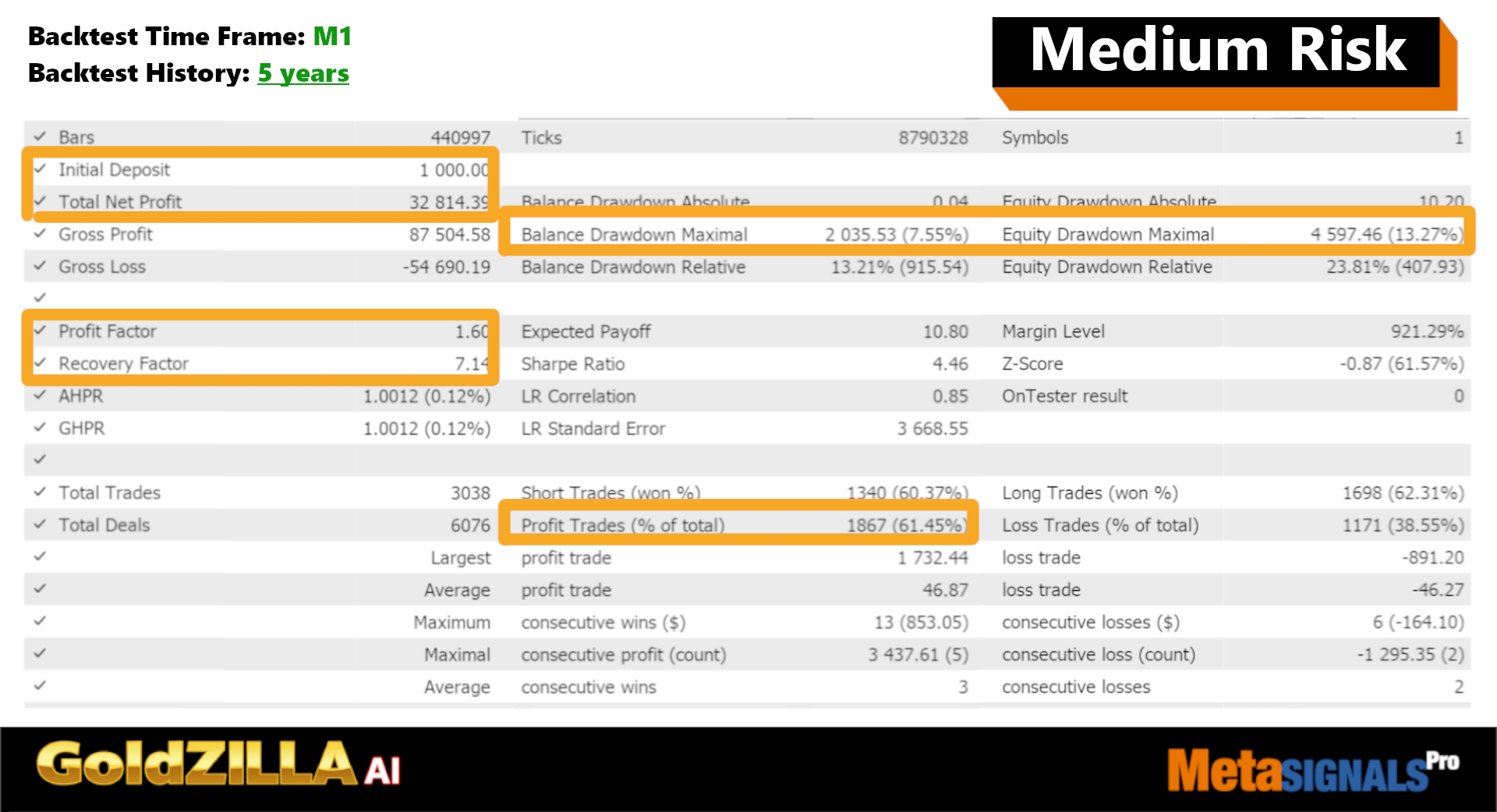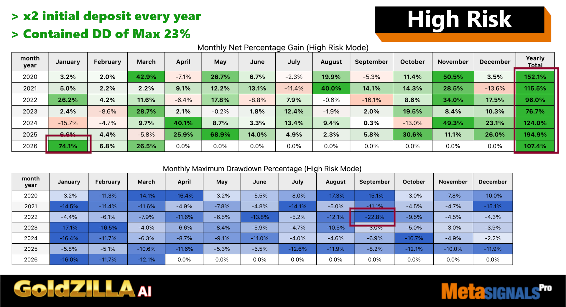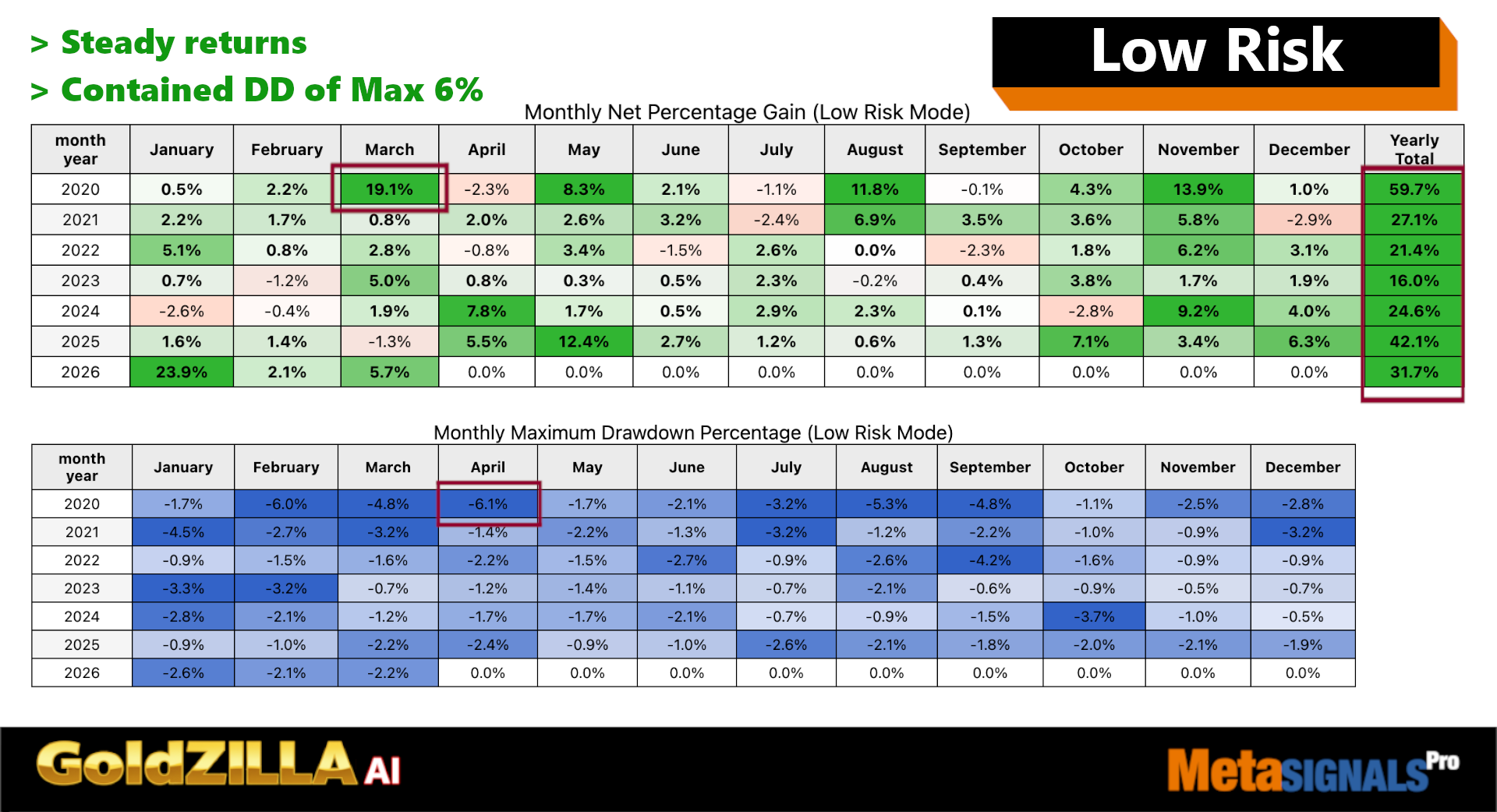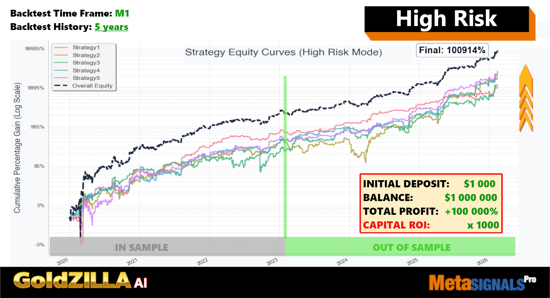 GoldZILLA AI is a multi-strategy algorithm detecting market regimes to dynamically select from five distinct strategies, optimizing returns while minimizing drawdown on XAUUSD.