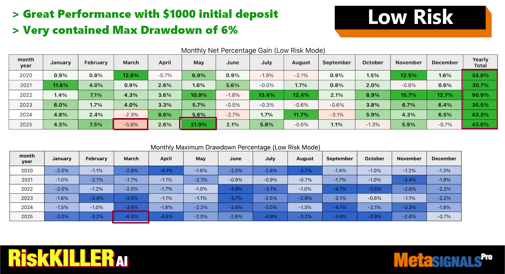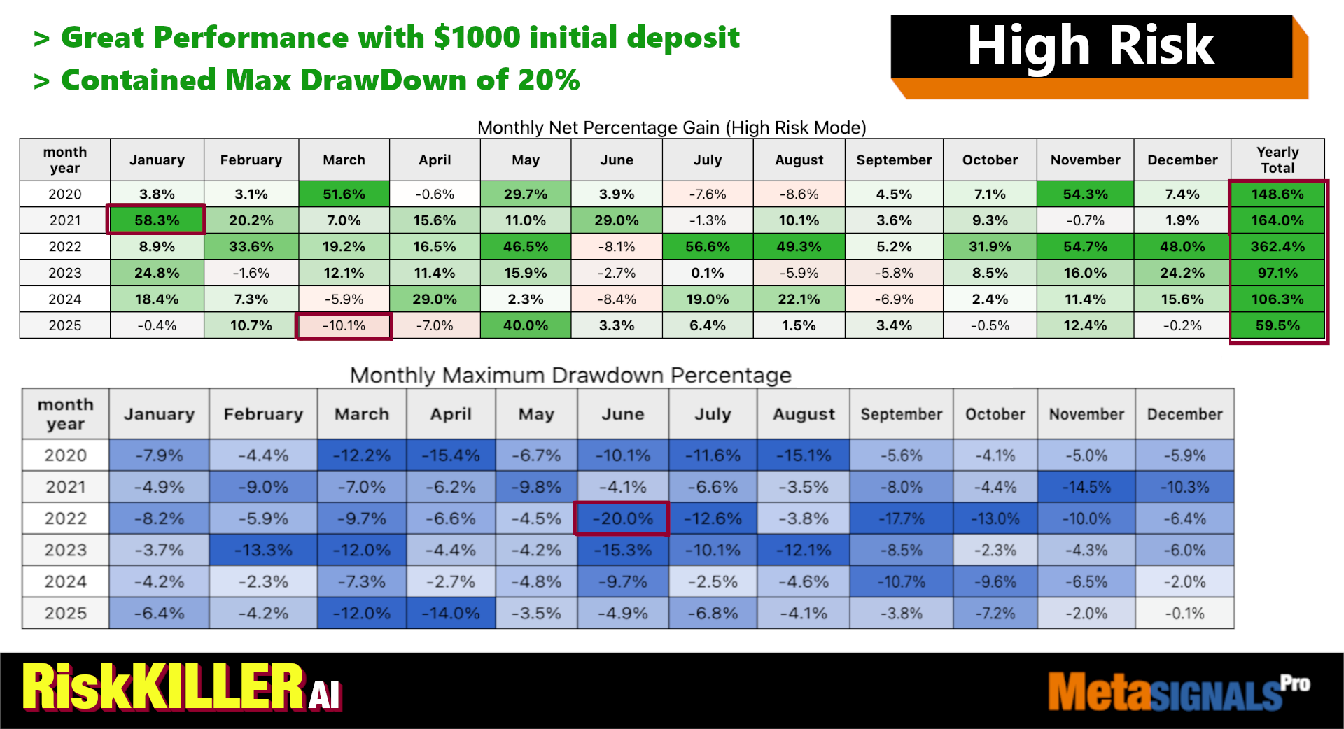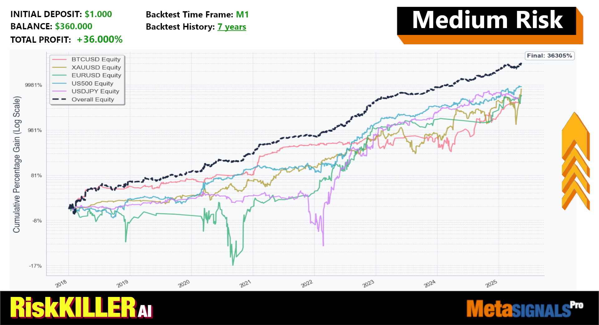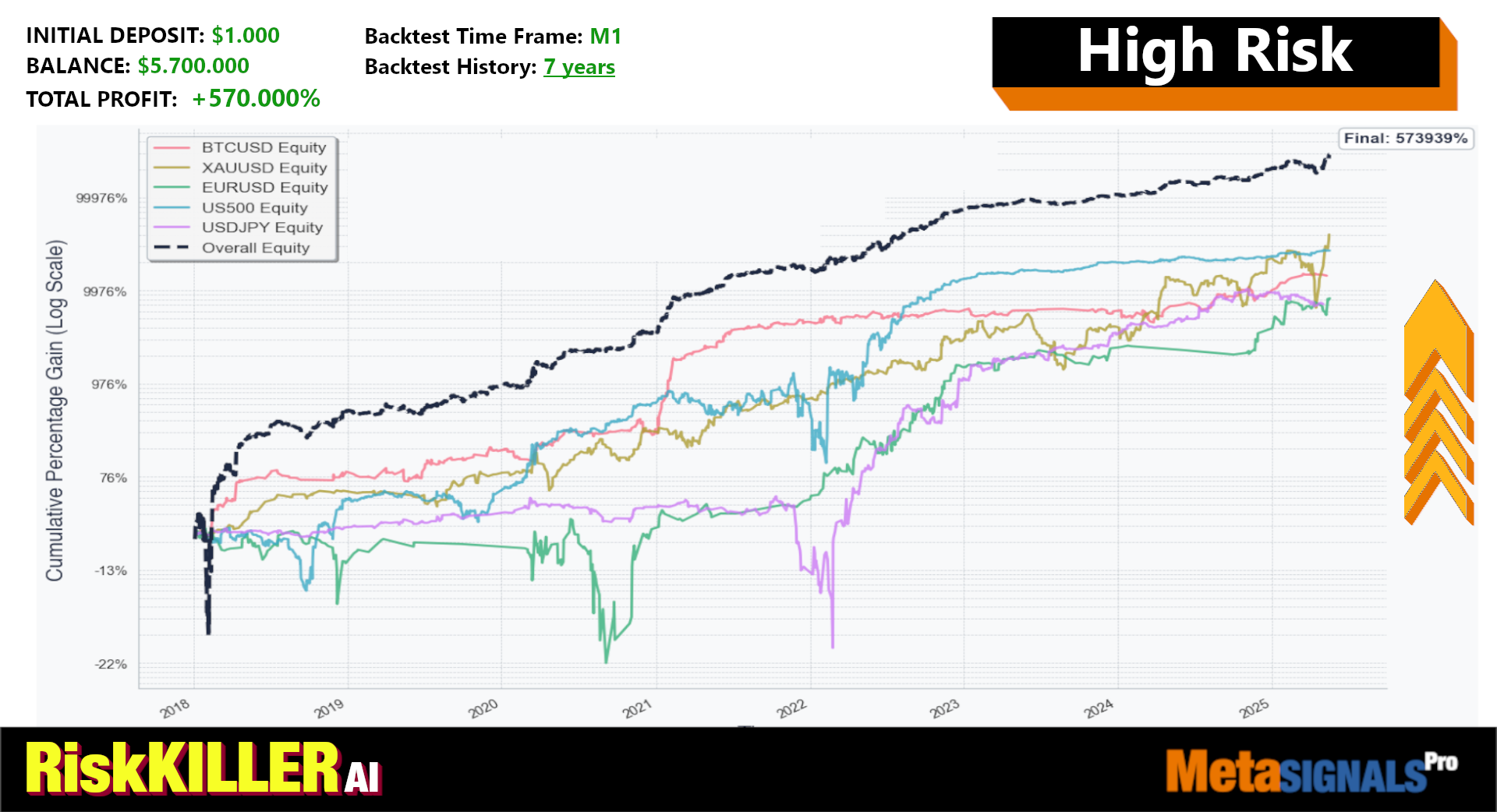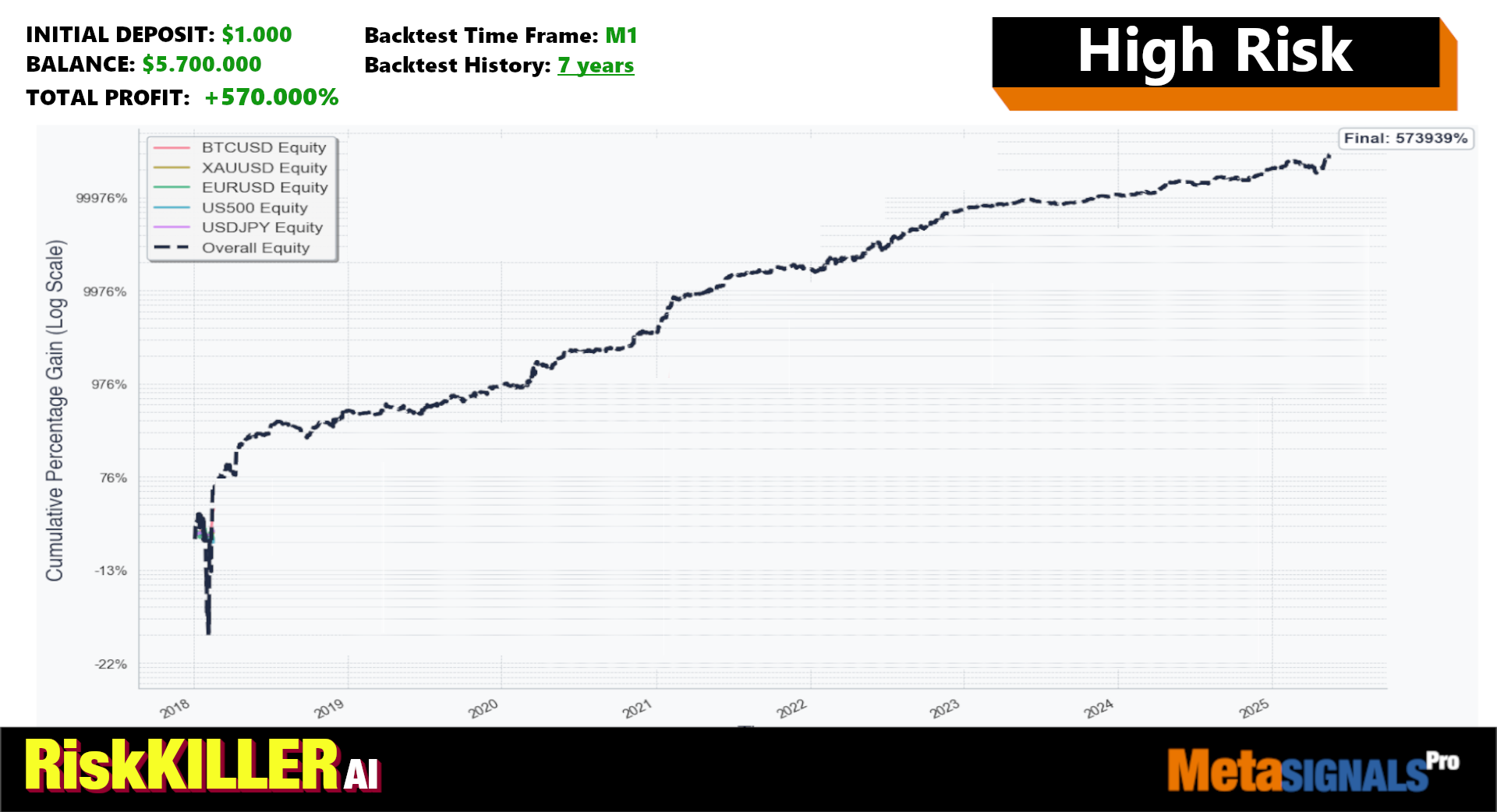 RiskKILLER AI is a breakout scalping algorithm identifying key levels for potential high-volatility moves, selecting best risk-reward trades while diversifying risk on 5 assets.