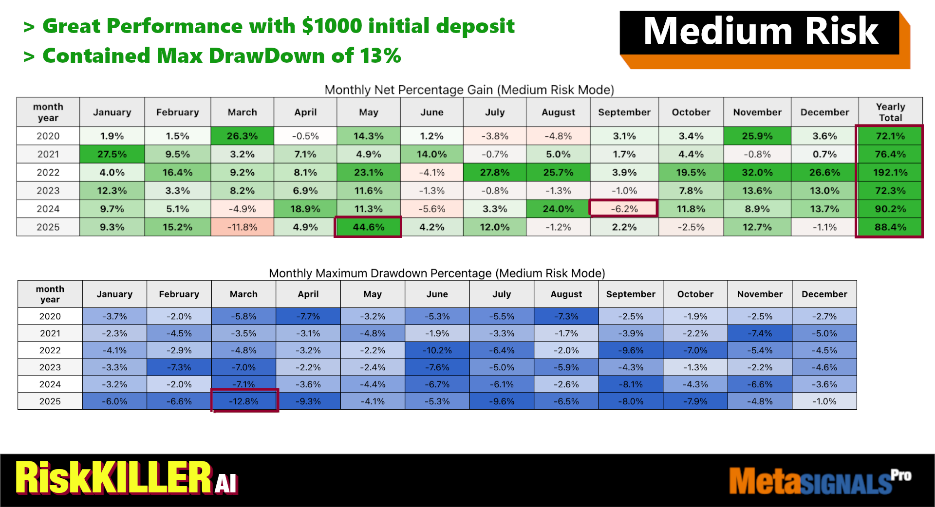 - Advises on adjusting the EA’s risk settings: “Lower Your Risk” / “Increase Your Risk” / “Stay at Medium Risk”